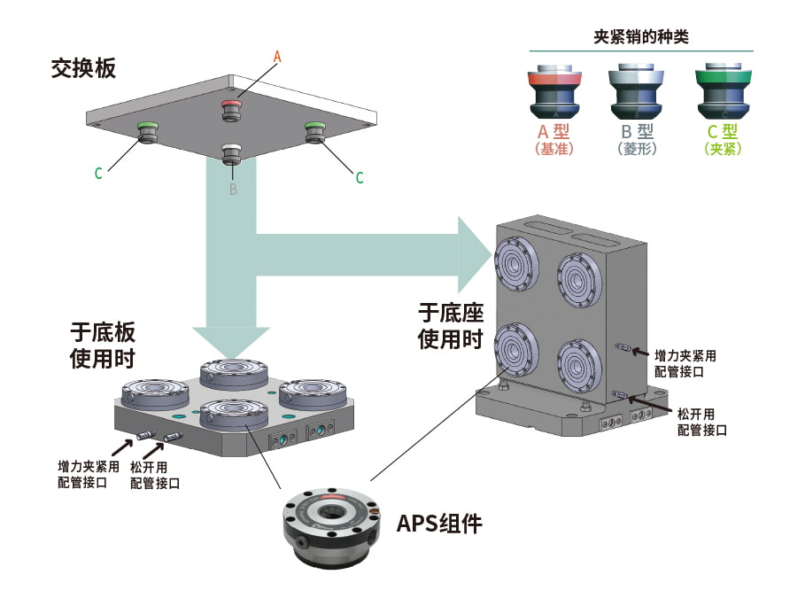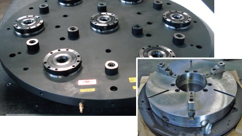 使用工场内部气压、通过圆锥销定位的方式,实现5μm以下的重复定位精度。追求夹具的自动化和多品种少批量的生产环境中做到高精度的工装快速切换。