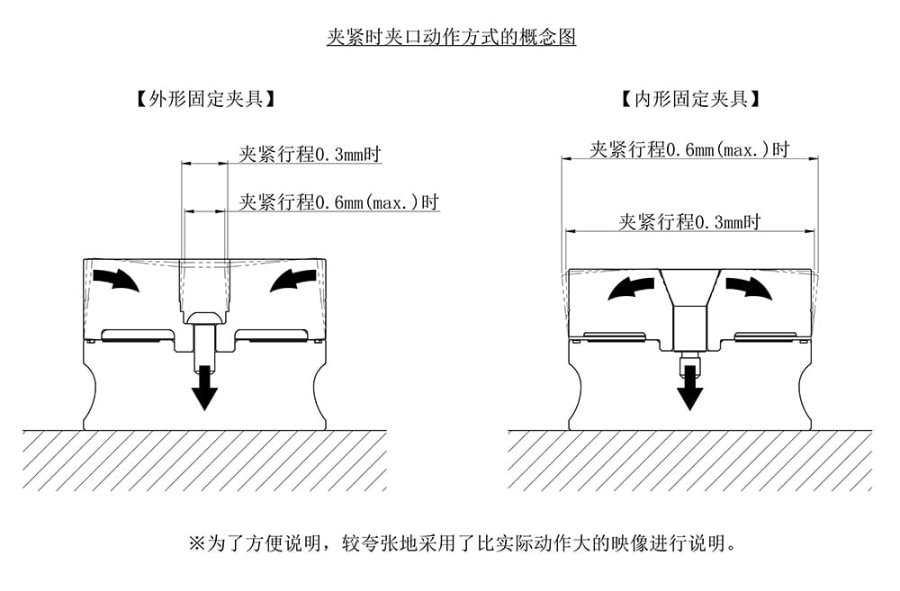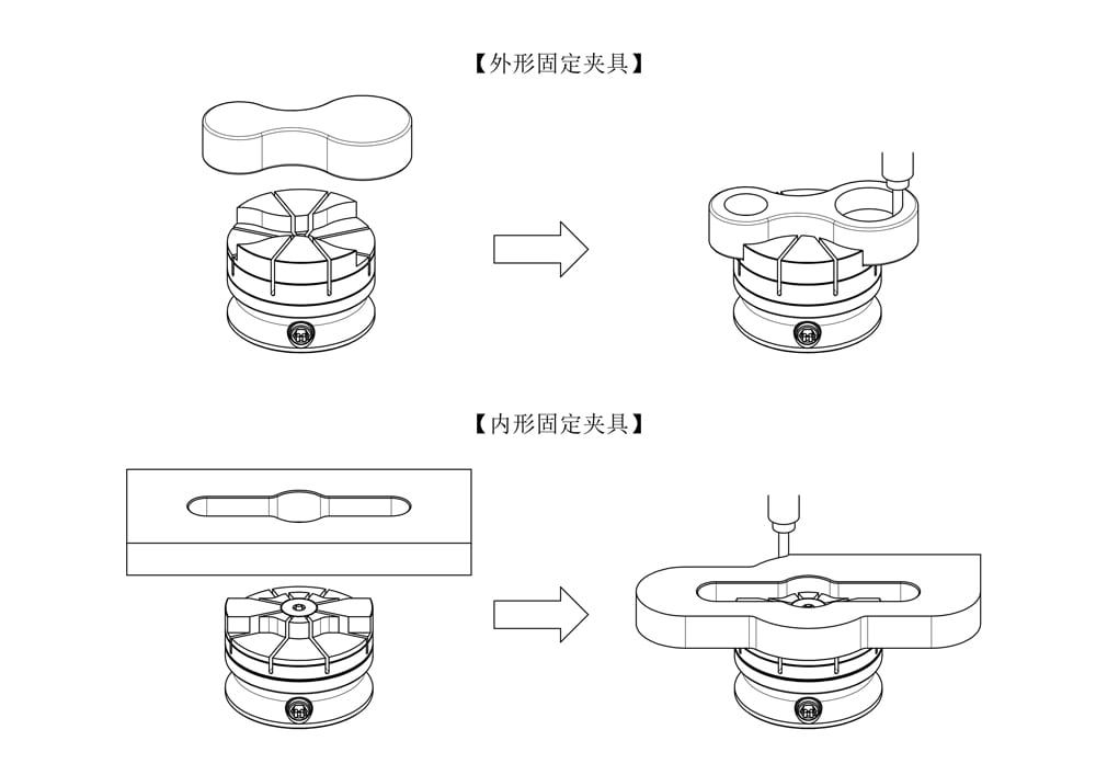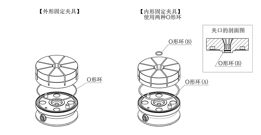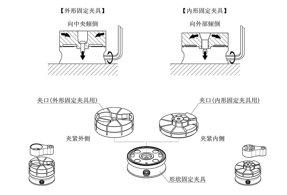 夹口分为外形固定夹具和内形固定夹具2种。通过交换夹口,外形固定夹具和内形固定夹具能够互相切换使用。