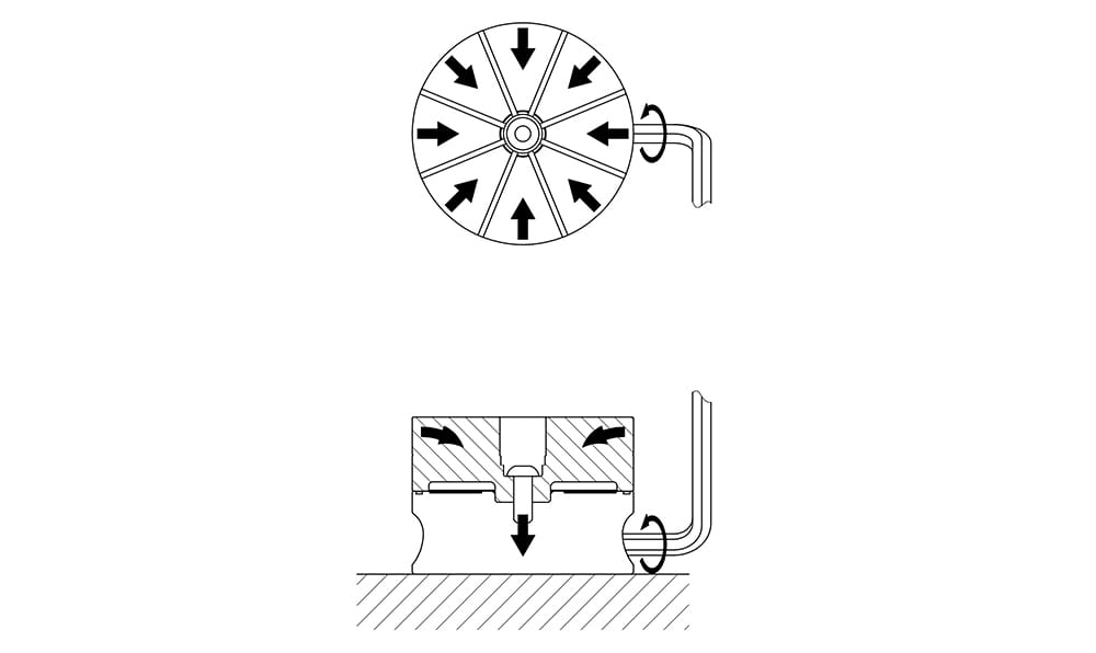 通过金属弹性变形的原理,夹紧时夹口从外8个方向往中央倾倒,从而牢牢夹紧工件的外形。