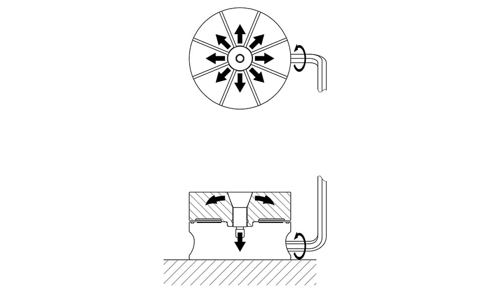 通过扩张螺栓的楔块和金属弹性变形的原理,夹紧时夹口由中央向外8个方向扩张,从而牢牢夹紧工件的内形。