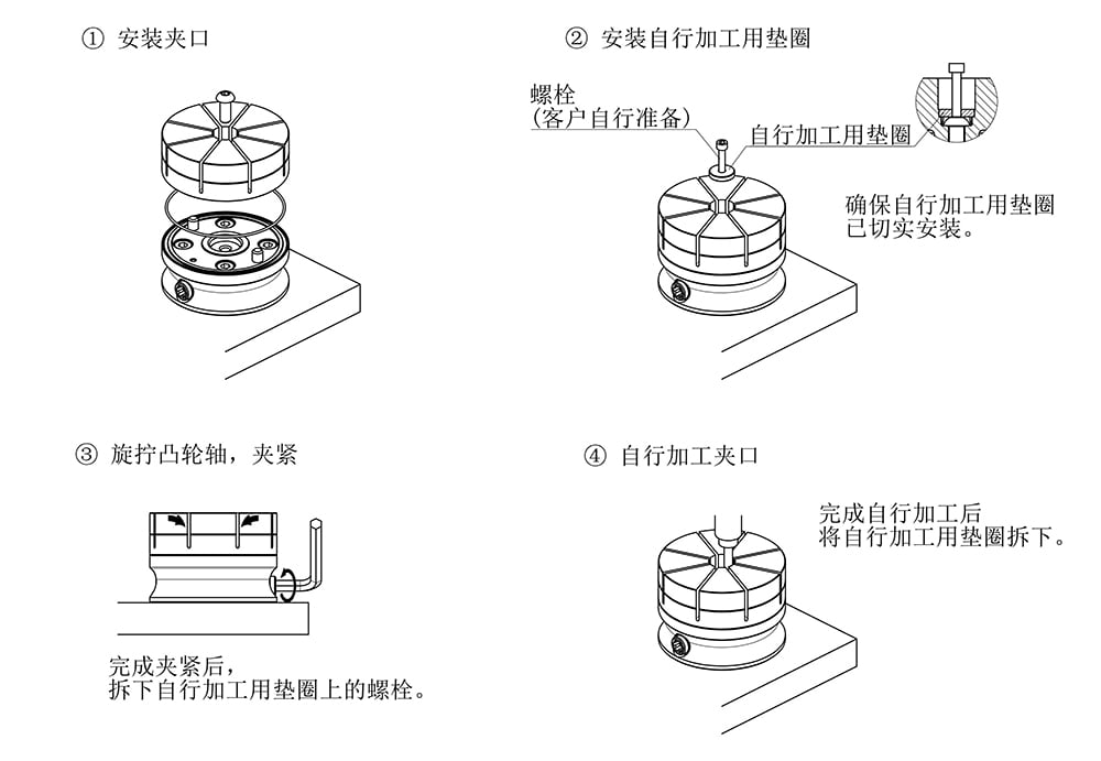 用推荐紧固扭矩(15N・m)紧固凸轮轴夹紧自行加工用垫圈。然后根据工件的形状、尺寸自行加工夹口。自行加工的步骤请参照下图。