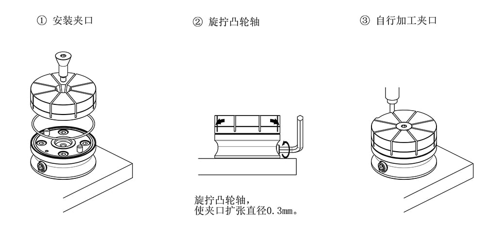 紧固凸轮轴使夹口直径扩张0.3mm后固定。然后根据工件的形状、尺寸自行加工夹口。(自行加工时扩张的直径0.3mm为工件的可拆卸间隙。)