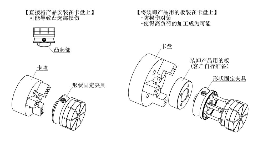CP125-12001・CP125-16001可以用卡盘夹紧使用,但可能会造成损伤,请注意。客户可以通过自己准备组装产品用的安装板,防止产品本体的损伤,同时也能实现高负荷加工。