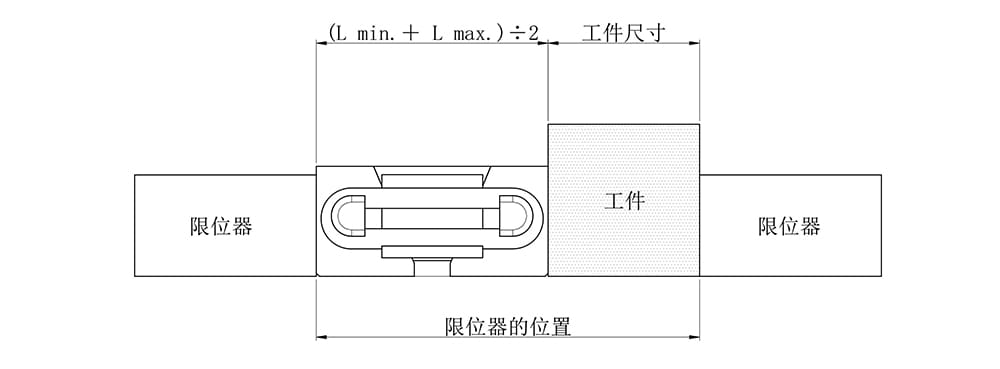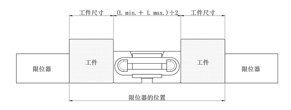 产品目录尺寸的 (L Min. + L Max.)÷2+工件尺寸 为夹紧行程中心的限位器的位置。
