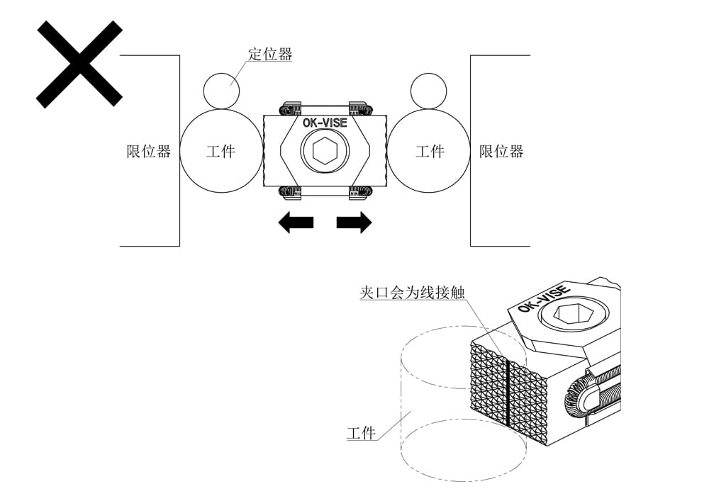 如果使用OK夹钳(经济型、单型、双型)夹紧圆形工件,夹口会为线接触,根据应力夹口有可能会发生损坏。