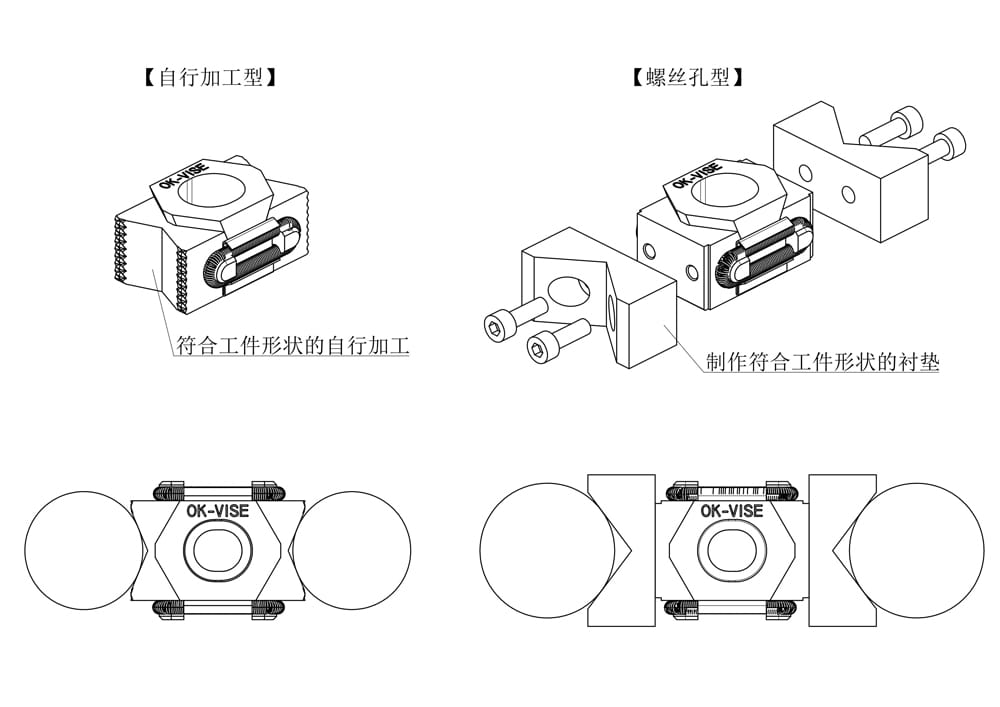 夹紧圆形工件时推荐将自行加工型的夹口根据工件形状完成加工,或者在螺丝孔型的螺孔上安装符合工件形状的衬垫后再使用。